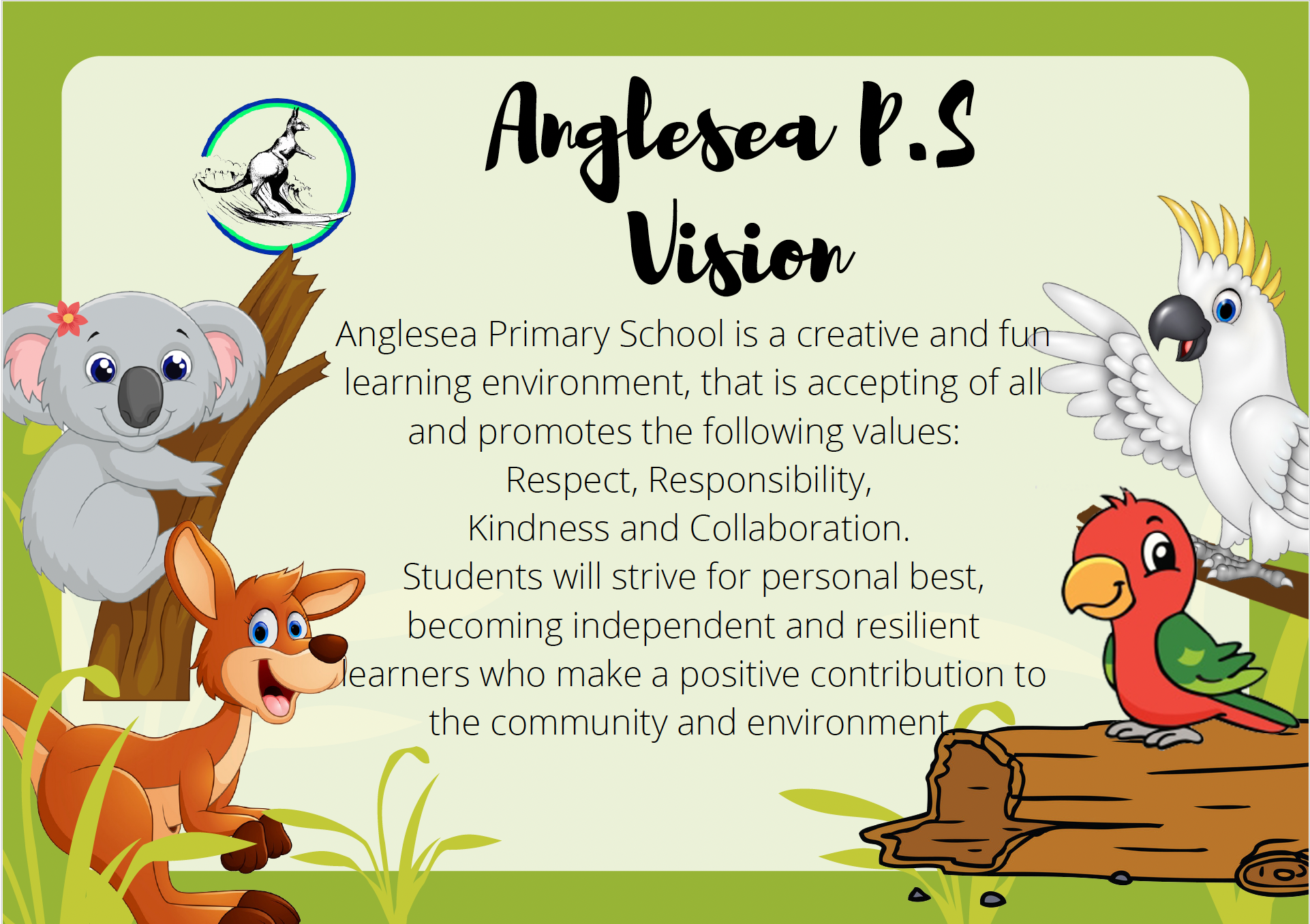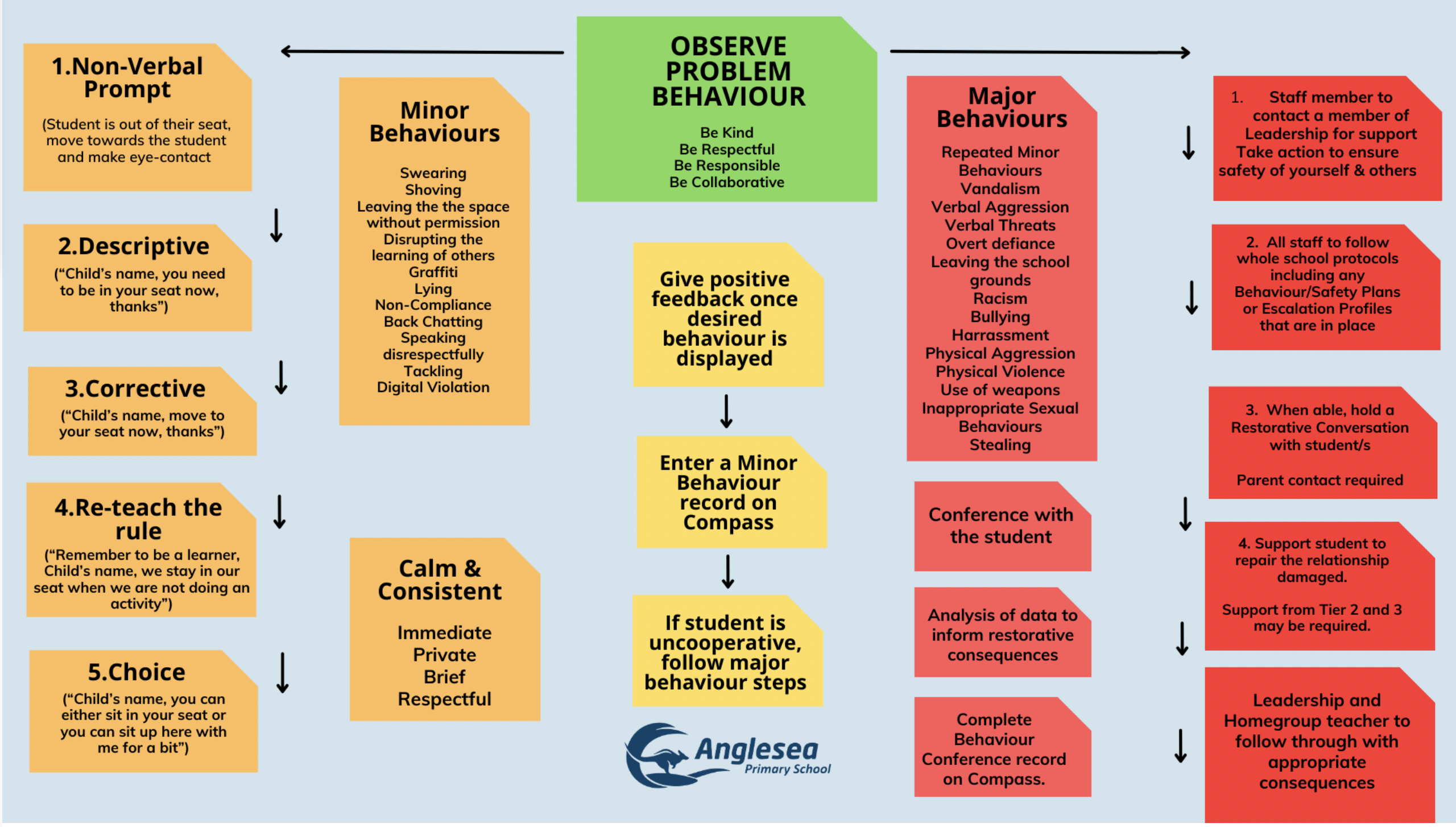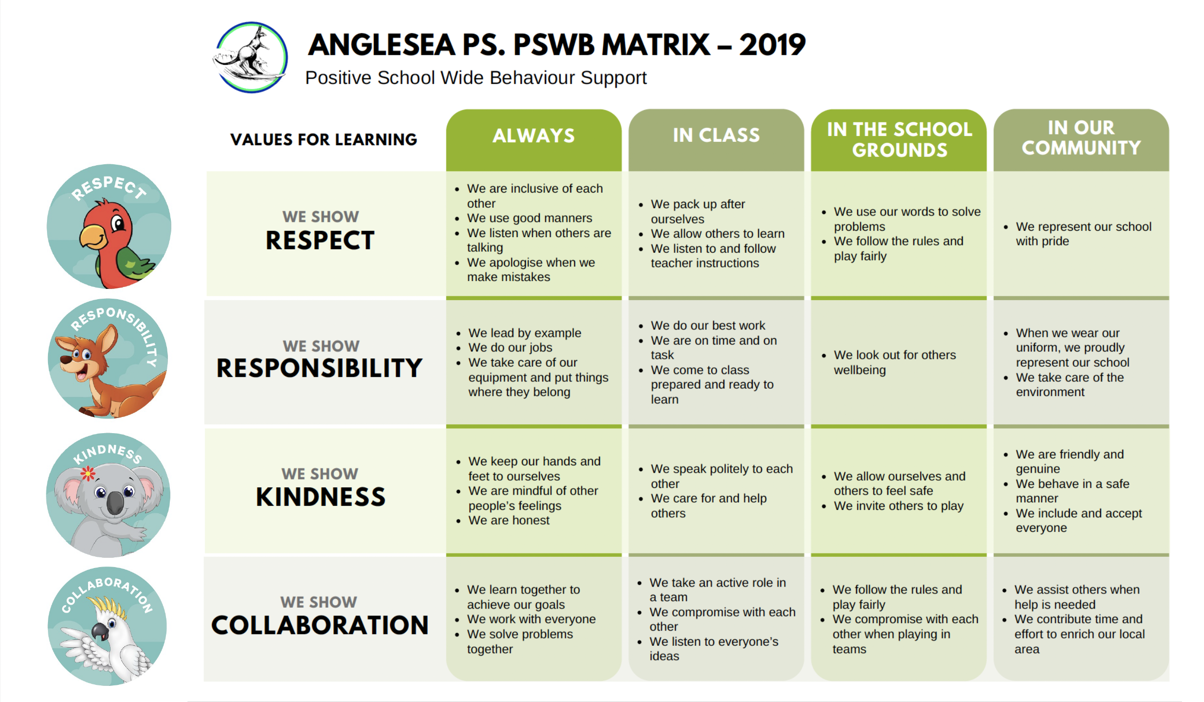 Anglesea Primary School has developed a Positive Behaviour Expectations matrix which is displayed prominently throughout the school. This matrix clearly states the behaviours we expect of our students in all settings within the school. The behaviour expectations have been grouped in accordance to our school values of Respect, Responsibility, Kindness and Collaboration.